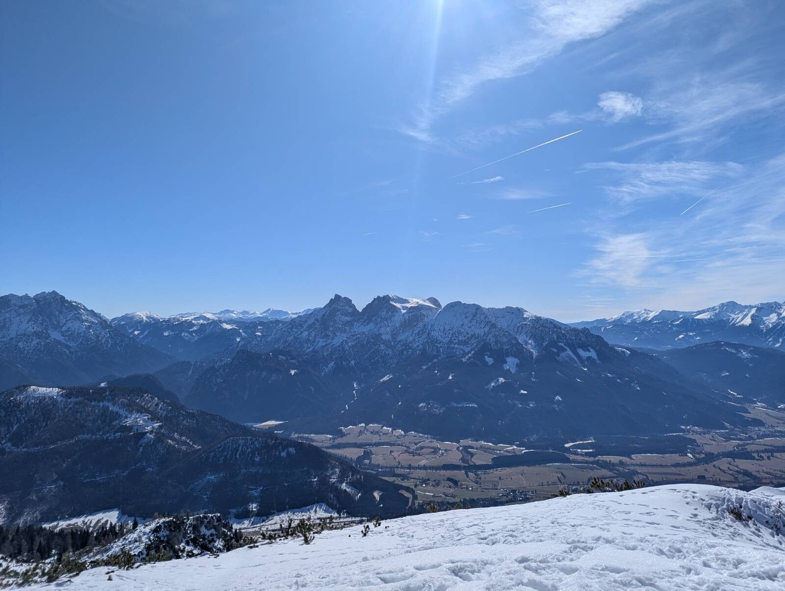 Ausblick vom Buchstein zum Admonter Reichenstein, Bösenstein u. Dachstein. Abfahren die schneeleeren Latschen den langen steilen Hang runter.