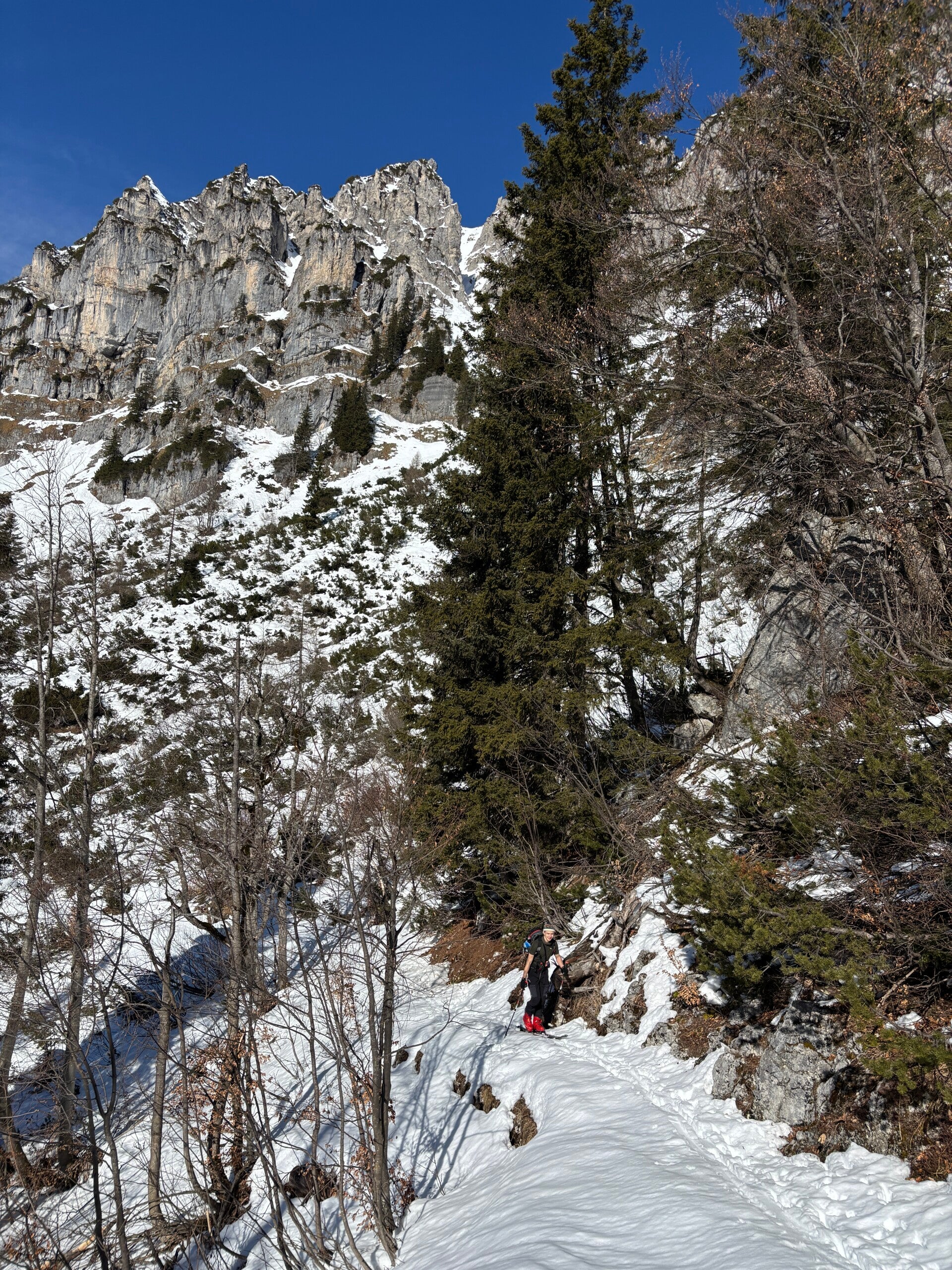 Am sonnigen Samstag im Auto zum Bucheggersattel. Mit viel grün auf wenig Schnee den Forstweg rauf. Der Winter Weg östlich ist unverspurt. Vor der Alm eine Böschung rauf und am Sommer Weg bis zum Grabnerstein. Der zu querde Hang sieht noch vernünftig aus, ist aber mit zunehmendem Tagesgang gefährlich.
